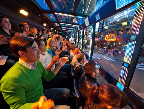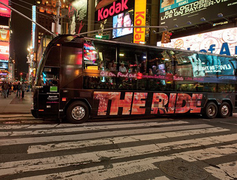 THE RIDE gives you a front-row seat to the streets of New York City in a multi-million dollar motor coach that comes equipped with state-of-the-art audio/visual technology, including 40 plasma screen TVs and over 3000 LED lights. Enjoy the performance from the comfort of one-of-a-kind stadium seating and huge panoramic windows.