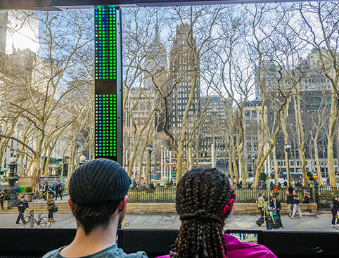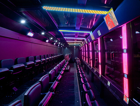 Each coach is equipped with 3000 LED lights, 40 flat screen monitors and three rows of stadium-style seating facing floor to ceiling glass windows, allowing you to experience New York in an entirely new way!