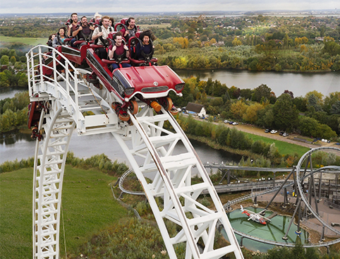The UK's first winged rollercoaster! Have you got what it takes to survive this death-defying flight through apocalyptic devastation? Experience the head-first 127ft inverted drop, then rip through the sky with pull of up to 4.5Gs.