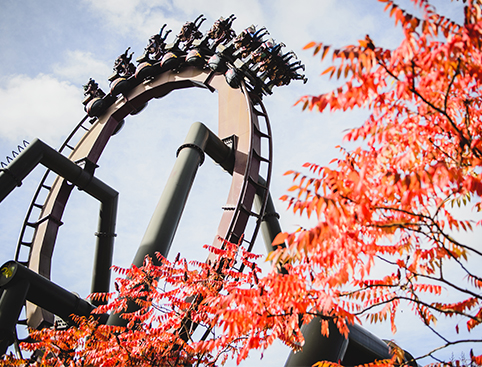 Delve into the depths of hell on Nemesis Inferno, the inverted coaster that speeds into the fiery heat of a volcano on its spinning, diving journey through a vertical loop, zero-G roll, corkscrews and more.